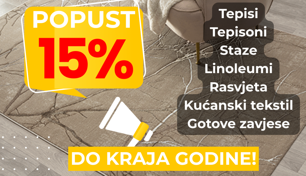 Do kraja godine vrijedi 15% popusta na tepihe, tepisone, staze, linoleume, rasvjetu, kućanski tekstil i gotove zavjese. ✨